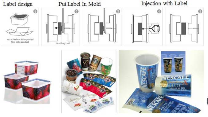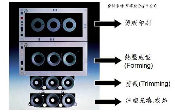 將印刷完成的薄膜利用不同型式置入模具,經射出成型后,得到具有印刷質感之成型,結合產品設計、模具技術部與傳統后加工技術為一體的制程技術。主要應用材料包含片材、樹脂、油墨三部分。